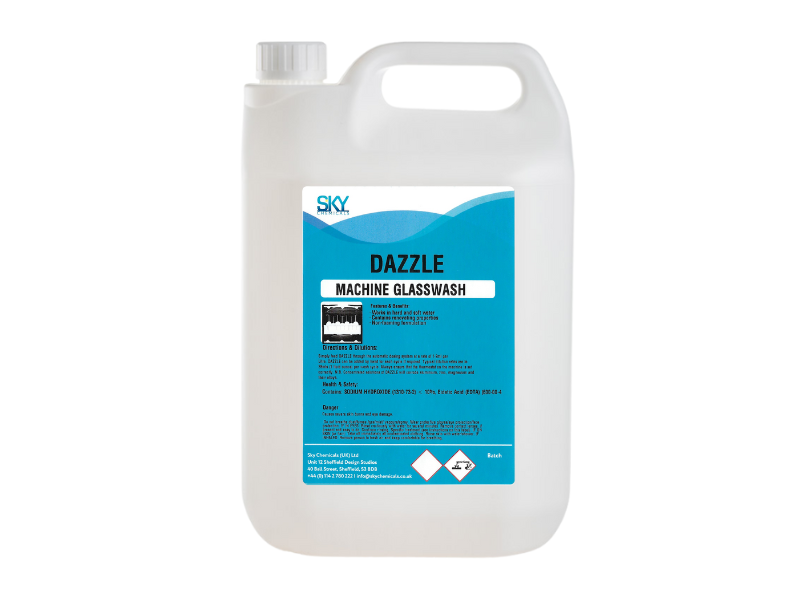 Dazzle is a clear liquid specially formulated for use in all automatic glass washing machines. n.b. It is not suitable for hand dishwashing.
